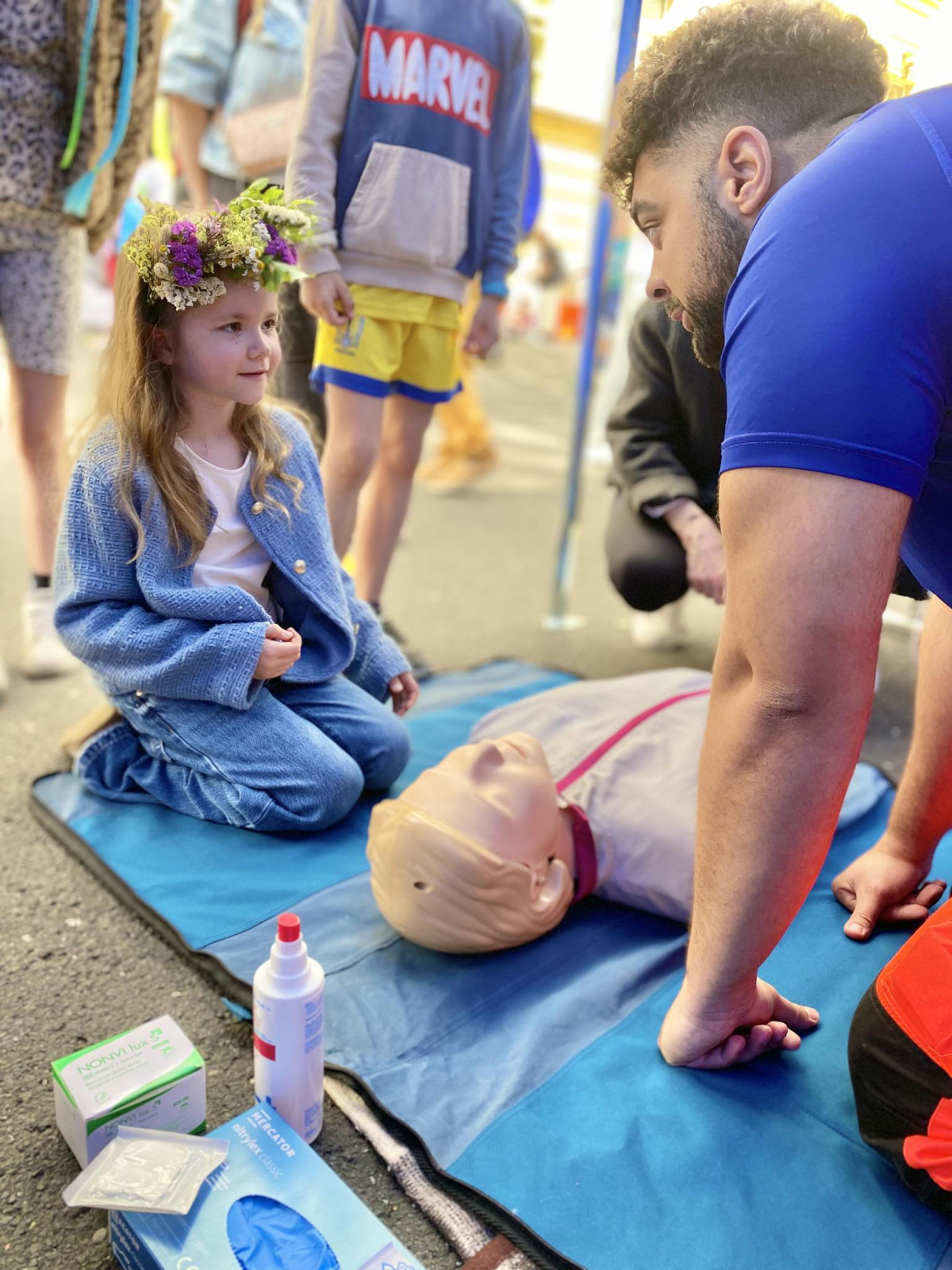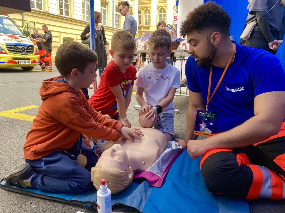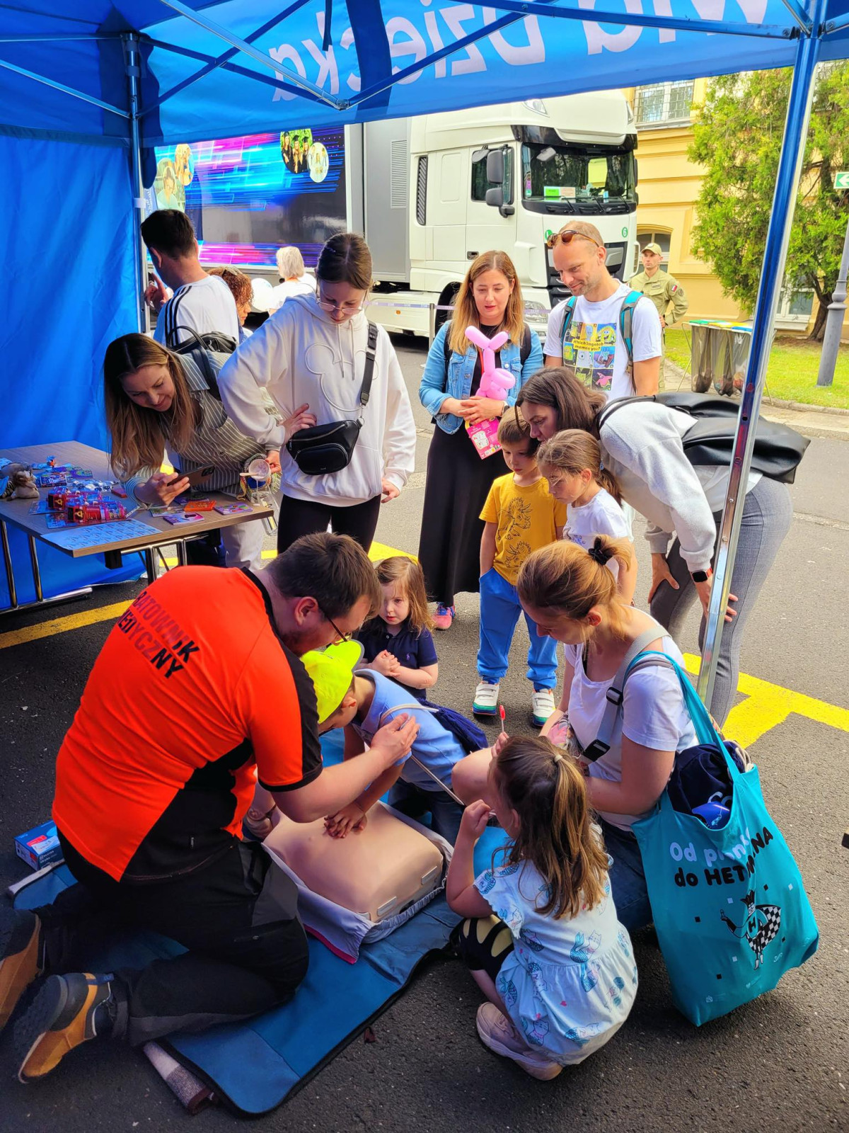 Nasze stoisko edukacyjne cieszyło się dużym zainteresowaniem – dzieci (i dorośli!) mogli nauczyć się podstaw udzielania pierwszej pomocy lub przypomnieć sobie, jak reagować w sytuacjach zagrożenia życia. To niezwykle ważne umiejętności, które – niezależnie od wieku – mogą uratować komuś zdrowie, a nawet życie.