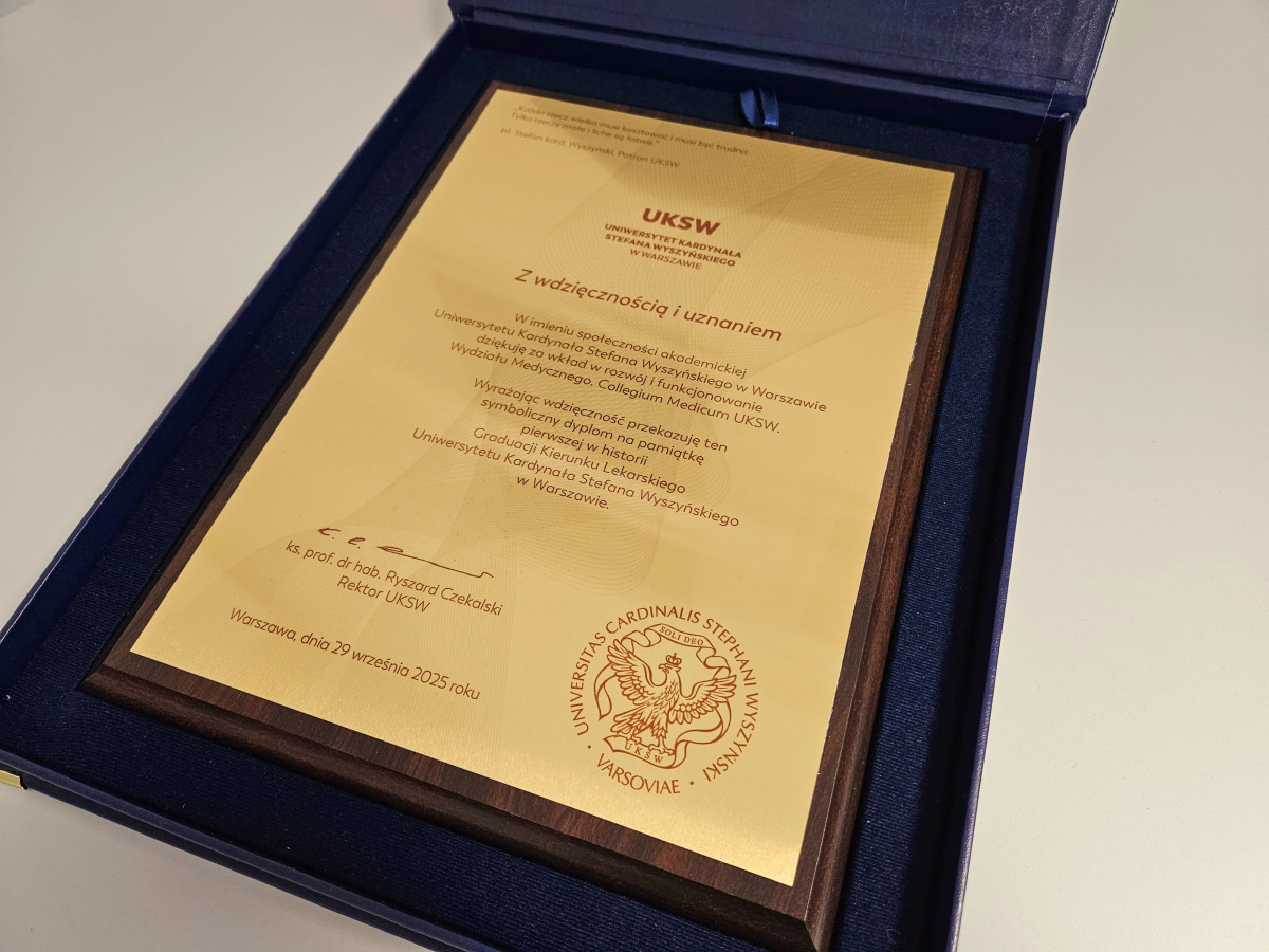 Wręczenie podziękowań Dyrektorowi dr. n. med. Markowi Migdałowi jest dowodem wzajemnego szacunku i współpracy pomiędzy Instytutem a Uniwersytetem Kardynała Stefana Wyszyńskiego oraz wyrazem uznania dla wkładu Instytutu w kształcenie przyszłych pokoleń lekarzy i pielęgniarek.