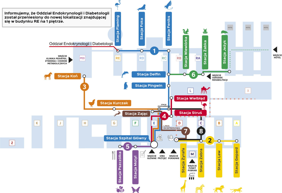 Pacjentów prosimy o podążanie za niebieską linią metra, która prowadzi bezpośrednio do budynku RE 1. piętro, gdzie znajduje się oddział.