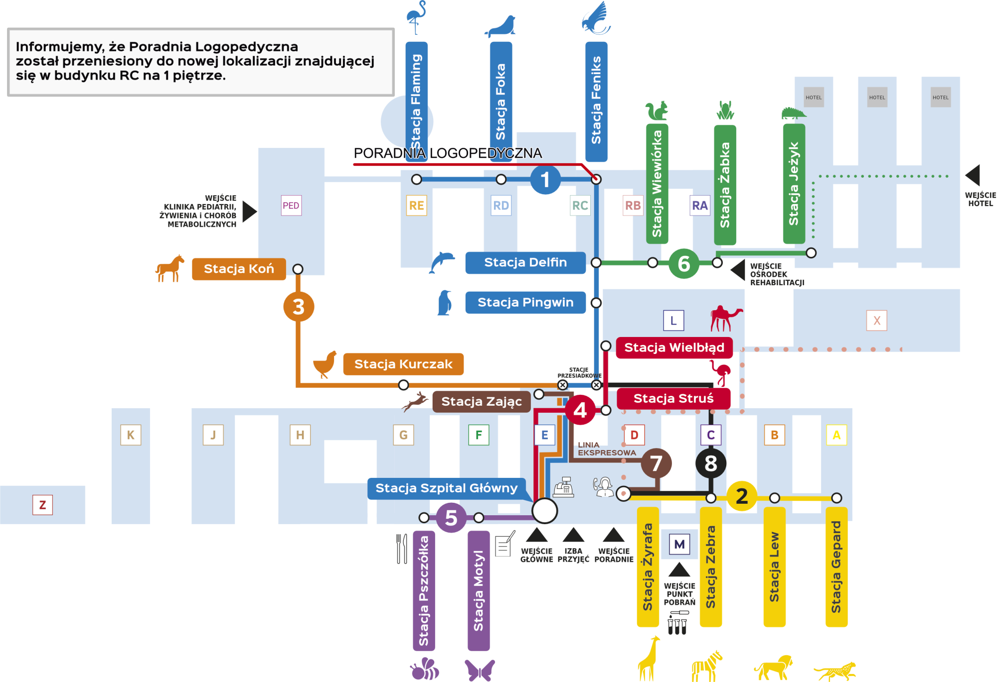 Pacjentów prosimy o podążanie za niebieską linią metra, która prowadzi bezpośrednio do budynku RC 1. piętro, gdzie znajduje się oddział.