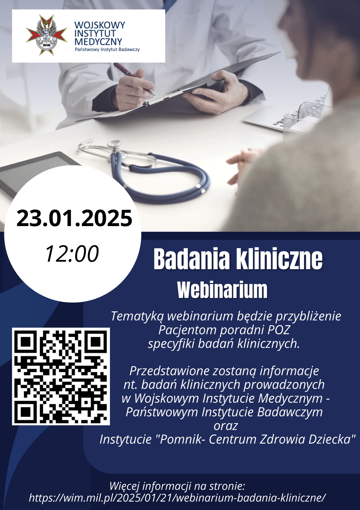 Serdecznie zapraszamy na webinar 23.01.2025 r. o godz. 12:00, który poświęcony będzie realizacji badań klinicznych w dwóch jednostkach prowadzących Centrum Wsparcia Badań Klinicznych – Instytut „Pomnik Centrum Zdrowia Dziecka” i Wojskowy Instytut Medyczny PIB. Webinar ma na celu zwiększenie świadomości wśród lekarzy POZ i pacjentów obszaru badań klinicznych.