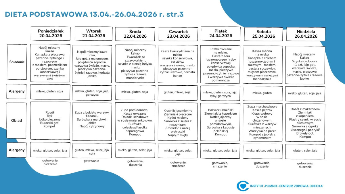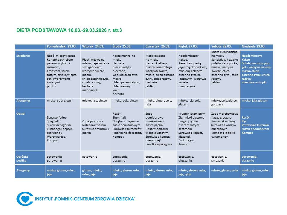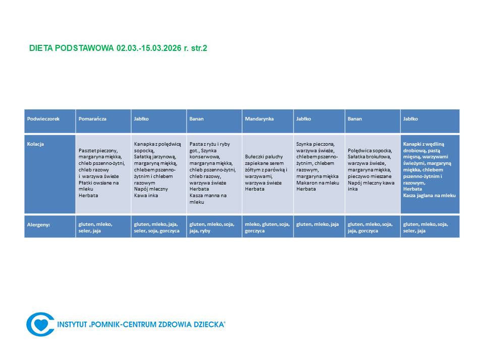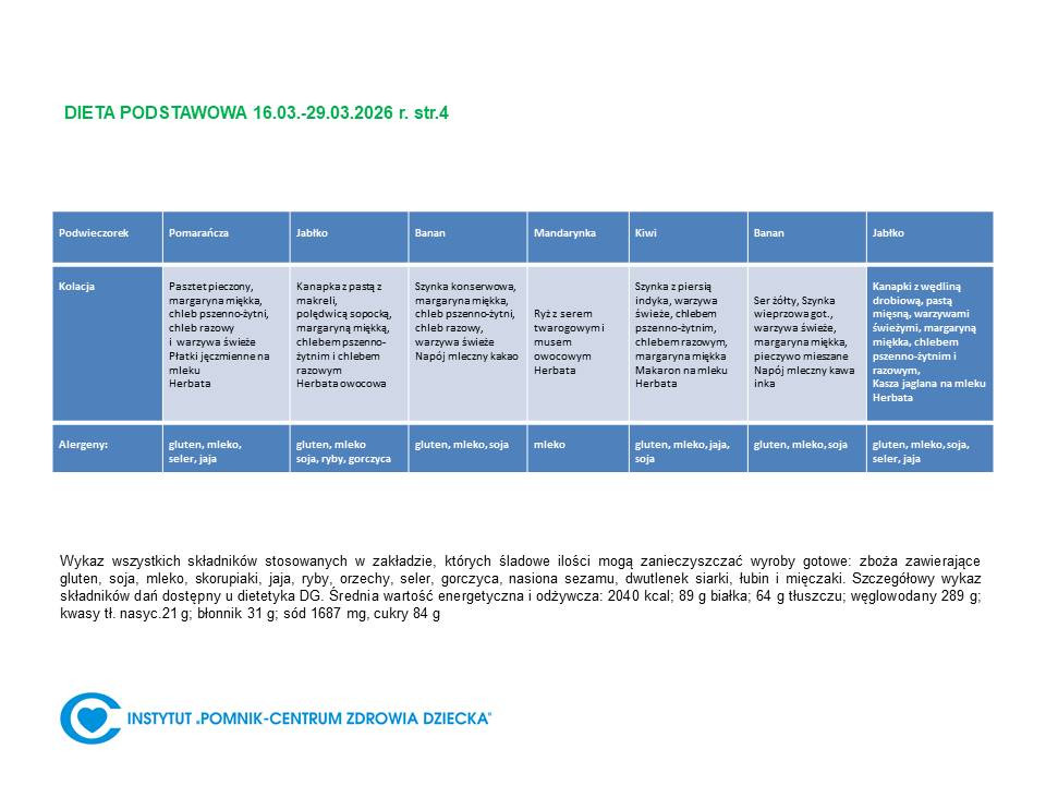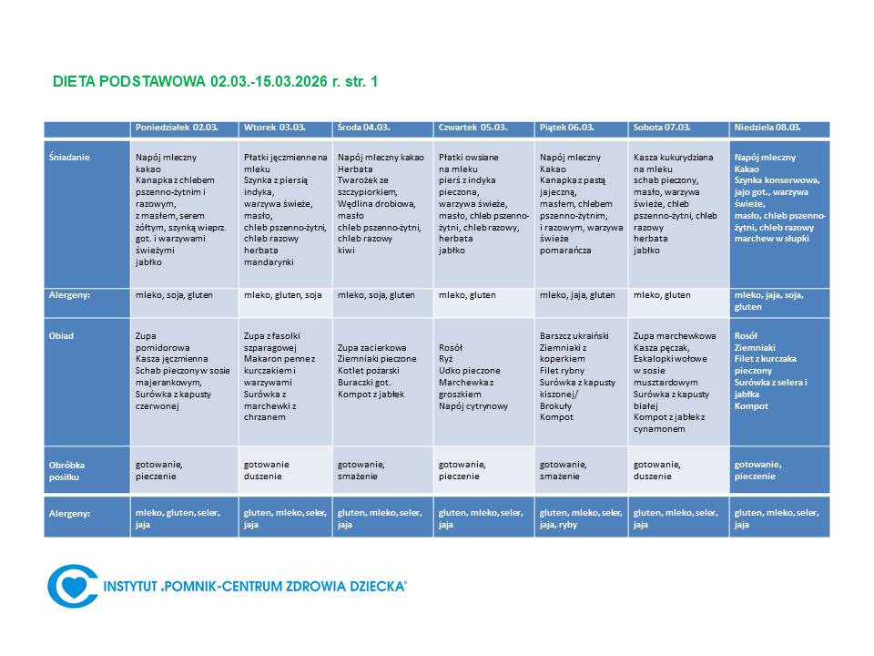 Lista diet obowiązująca w Instytucie „Pomnik – Centrum Zdrowia Dziecka”