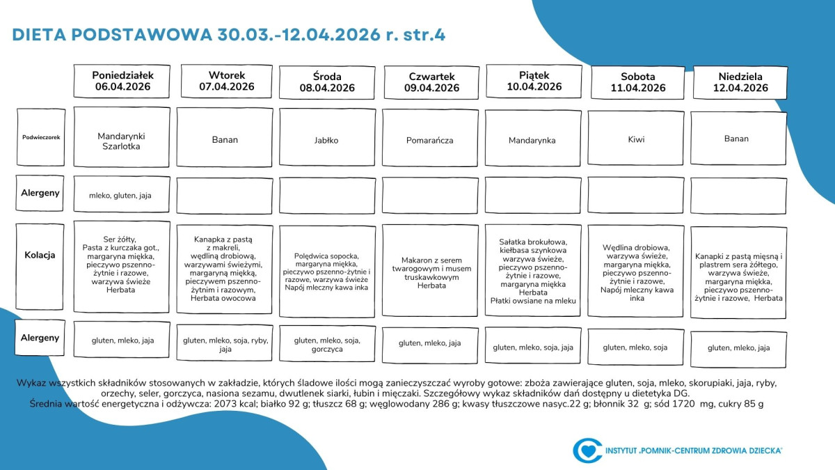 Lista diet obowiązująca w Instytucie „Pomnik – Centrum Zdrowia Dziecka”