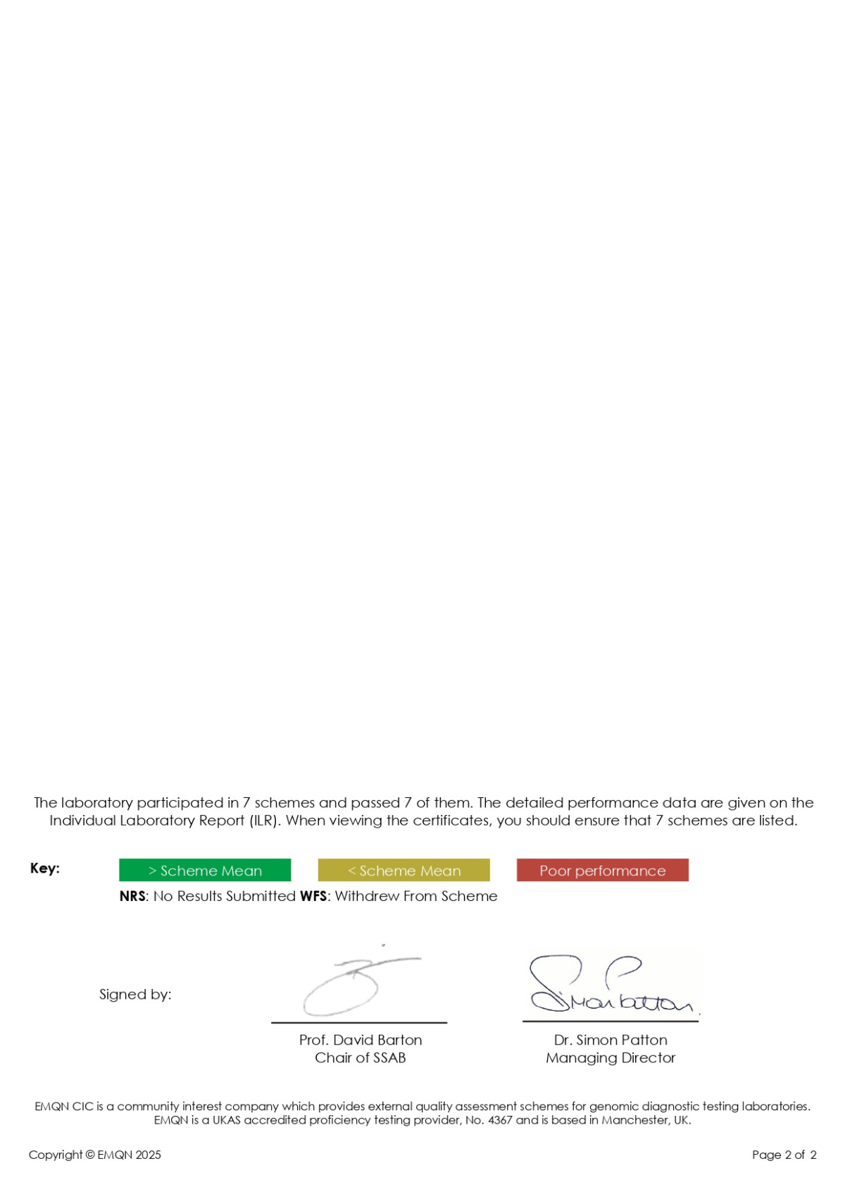 PGM od 2015 roku uczestniczy również w międzynarodowej certyfikacji European Molecular Genetics Quality Network (EMQN). Uzyskane certyfikaty EMQN w zakresie analizy sekwencjonowania, analizy wzoru metylacji DNA w regionach związanych z zespołami Pradera i Willego, Angelmana (PWS/AS), Beckwitha i Wiedemanna oraz Silvera i Russella (BWS/SRS) oraz analizy mitochondrialnego DNA (mtDNA), a także od 2021 roku w zakresie Sekwencjonowania Nowej Generacji (DNA Sequencing NGS v Germline), potwierdzają wykonywanie tych badań zgodnie z obowiązującymi standardami europejskimi. Od 2007 roku Pracownia posiada wdrożony system jakości ISO 9001.