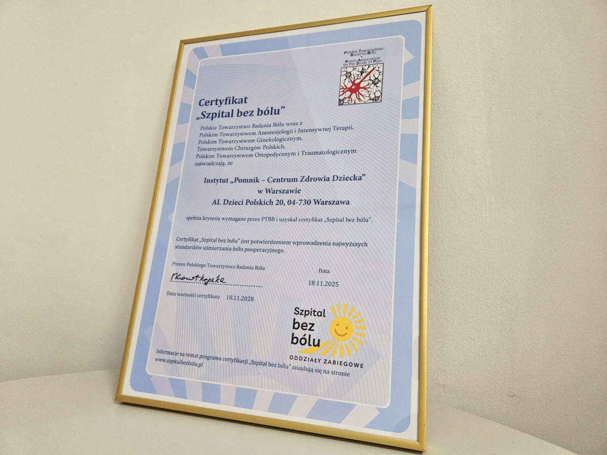 Z radością informujemy, że kliniki zabiegowe Instytutu „Pomnik-Centrum Zdrowia Dziecka” po raz kolejny uzyskały prestiżowy certyfikat „Szpital Bez Bólu”, który potwierdza stosowanie wysokich standardów leczenia i monitorowania bólu. Wyróżnienie to jest wyrazem konsekwentnego podejścia IPCZD do zapewnienia pacjentom bezpieczeństwa, komfortu oraz możliwie najmniejszego dyskomfortu związanego z leczeniem i pobytem w szpitalu.