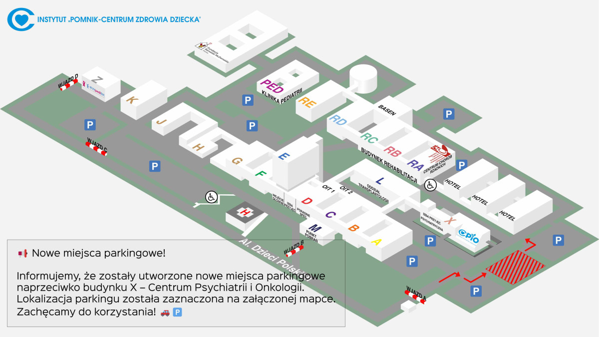 W związku z prowadzonymi pracami budowlanymi przy budynku Rehabilitacji, informujemy o udostępnieniu nowych miejsc parkingowych dla pacjentów, pracowników oraz gości Instytutu.